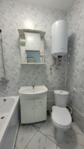 Санузел совмещенный, в котором очень лаконично и функционально установлена ванна, новая сантехника, мойка, шкафчик под мойку с дверцами и полочками, навесной умывальный шкафчик с зеркалом. Новый унитаз, бойлер Equation.