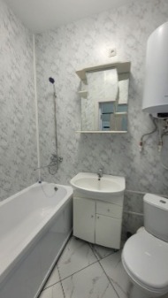 Санузел совмещенный, в котором очень лаконично и функционально установлена ванна, новая сантехника, мойка, шкафчик под мойку с дверцами и полочками, навесной умывальный шкафчик с зеркалом. Новый унитаз, бойлер Equation.